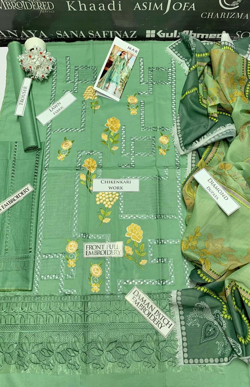 Elevate your wardrobe with this elegant 3-piece embroidered lawn suit in a refreshing green shade. Crafted for comfort and style, this ensemble is perfect for both casual and semi-formal occasions.