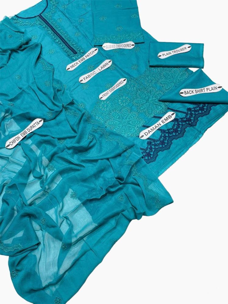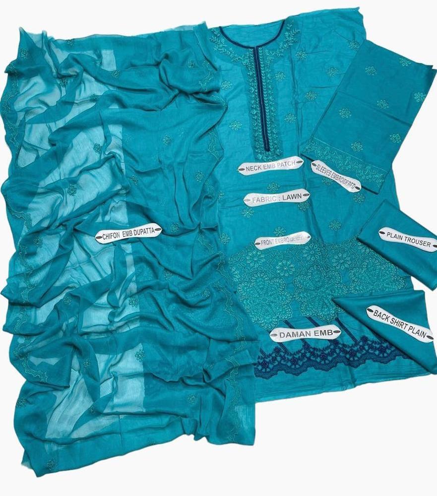 Elevate your wardrobe with this elegant 3-piece suit, crafted from premium Swiss Lawn fabric. The shirt features exquisite embroidery on the front, while the back remains plain for a balanced look. Paired with a lightweight chiffon dupatta, this ensemble is perfect for both casual and formal occasions.