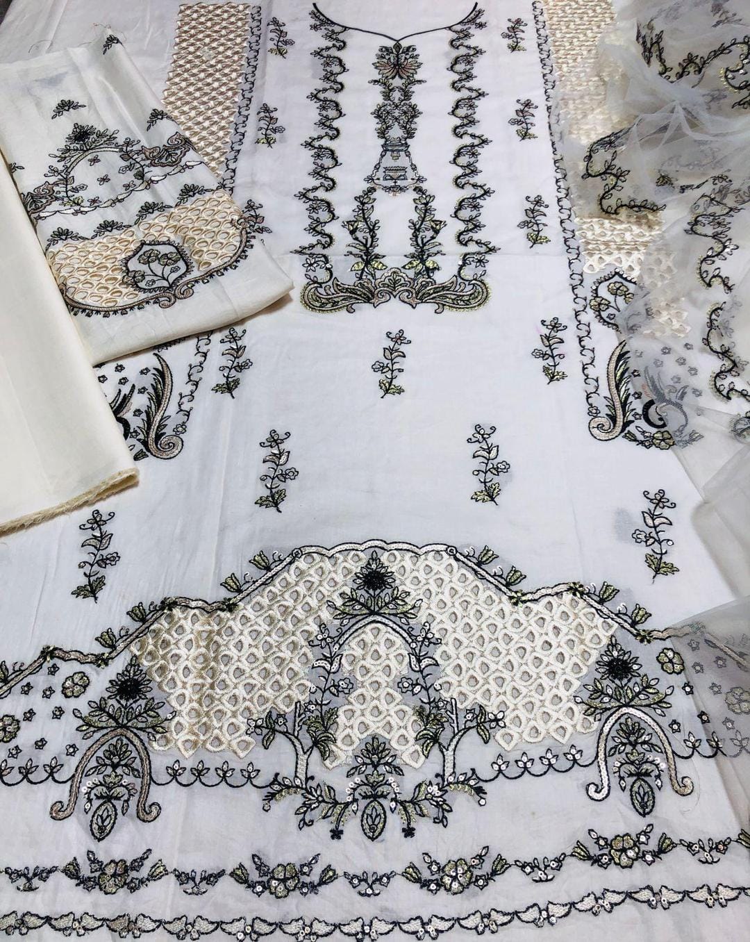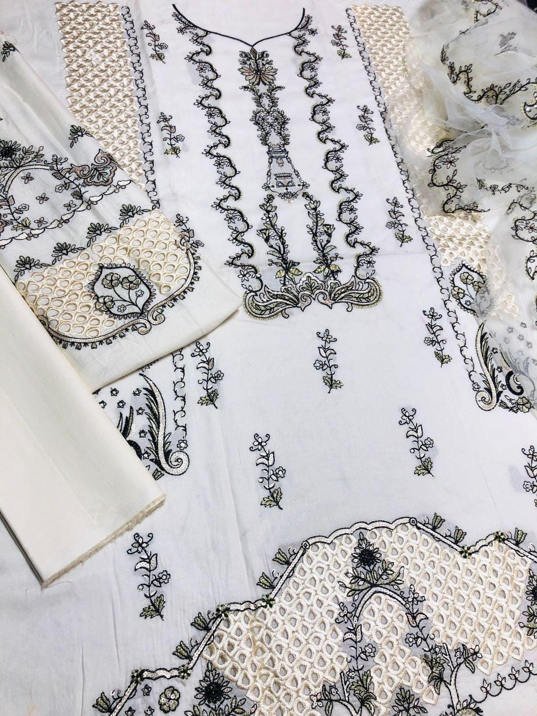 Add timeless elegance to your wardrobe with this sophisticated 3-piece unstitched embroidered suit in a serene off-white hue. Made from breathable lawn fabric, the shirt showcases intricate embroidery on the front and daman, offering a delicate blend of tradition and style. It’s paired with a plain lawn trouser for a clean, classic look, while the beautifully embroidered dupatta adds a graceful finishing touch—ideal for festive wear, formal events, or summer occasions.